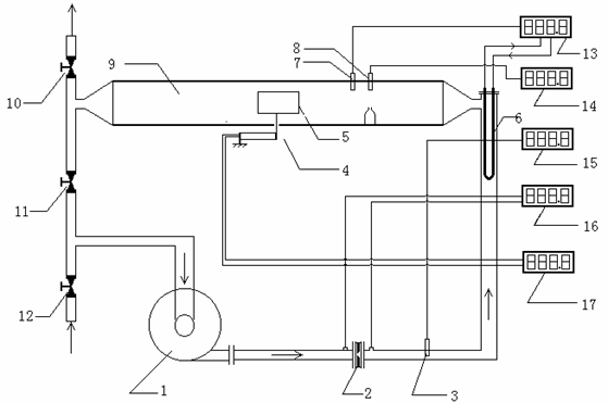 1—离心风机;2—孔板流量计;3、15—孔板流量计处温度计显示仪;4、17—重量传感器显示仪;