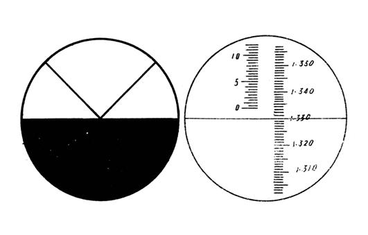 ⑹读数镜筒中看到的右列刻度读数则为待测物质的折光指数数值ND(如附图5-2所示)。